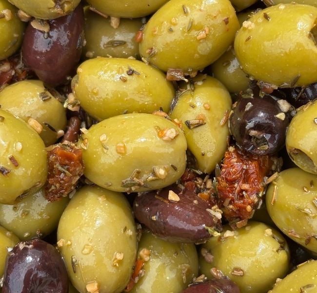 Halkidiki & Kalamata Olives, White Wine Vinegar, Olive and Vegetable Oil, Dried Rosemary, Dried Thyme, Garlic and Sundried Tomato